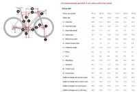 Available sizes: 50 (saddle height range minimum 61,5cm and maximum 68cm) - 52 (min 64,5cm and max 70,5cm) - 54 (min 67,5cm - max 73,5cm) - 56 (min 74cm - max 80cm) - 58 (min 76cm - max 82cm).
